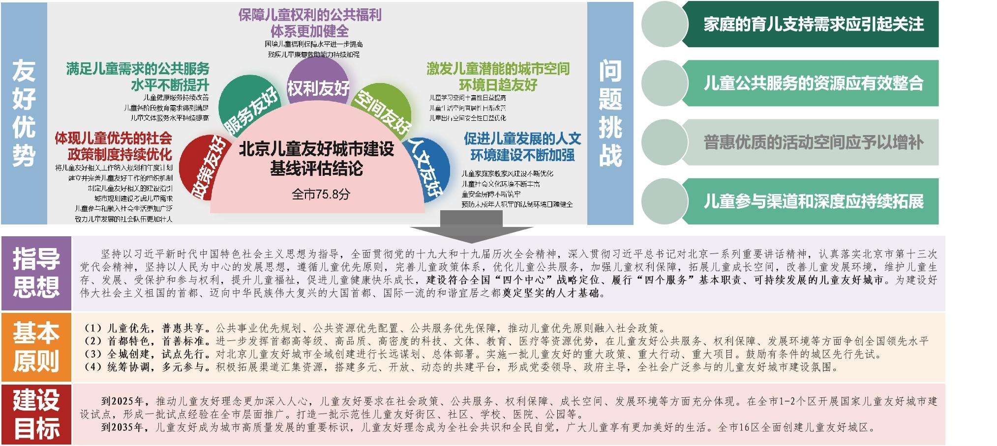 为“创建具有首都超大城市特色的儿童友好城市”及“发挥空间规划的战略引领作用”,项目聚焦“首都定位”“儿童视角”“北京特色”“规划事权”,围绕儿童生存、发展、受保护和参与四项基本权利,扫描城市空间供给现状,建立儿童友好城市规划体系框架,形成“1+3+2”的成果体系,包括1册主报告、3册分报告和2册附件。