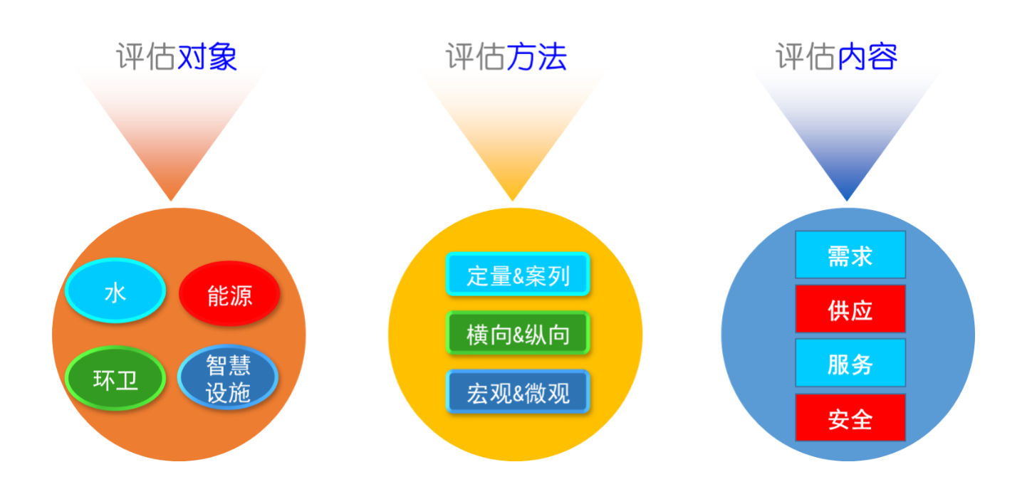 评估内容方面,涵盖水、能源、环卫、智慧设施四个系统15个专业需求发展、能力建设、服务水平等各环节。评价方法方面,采取定量评价与案例分析相结合、横向比较与纵向对比相结合、宏观体系评估与微观问题相结合方法,注重市政与人、地、房等多要素交叉分析,深入挖掘问题及成因。评价指标方面,沿袭总体规划资源、环境等维度18项指标基础上,一方面响应国家战略增加安全韧性等指标,另一方面突出市政基础设施公共服务属性,增加民生服务类指标,设置安全韧性、节约高效、支撑保障、绿色生态、民生服务、需求用量六个方面39项有全面性、代表性、科学性的市政基础设施专项体检评估指标体系。