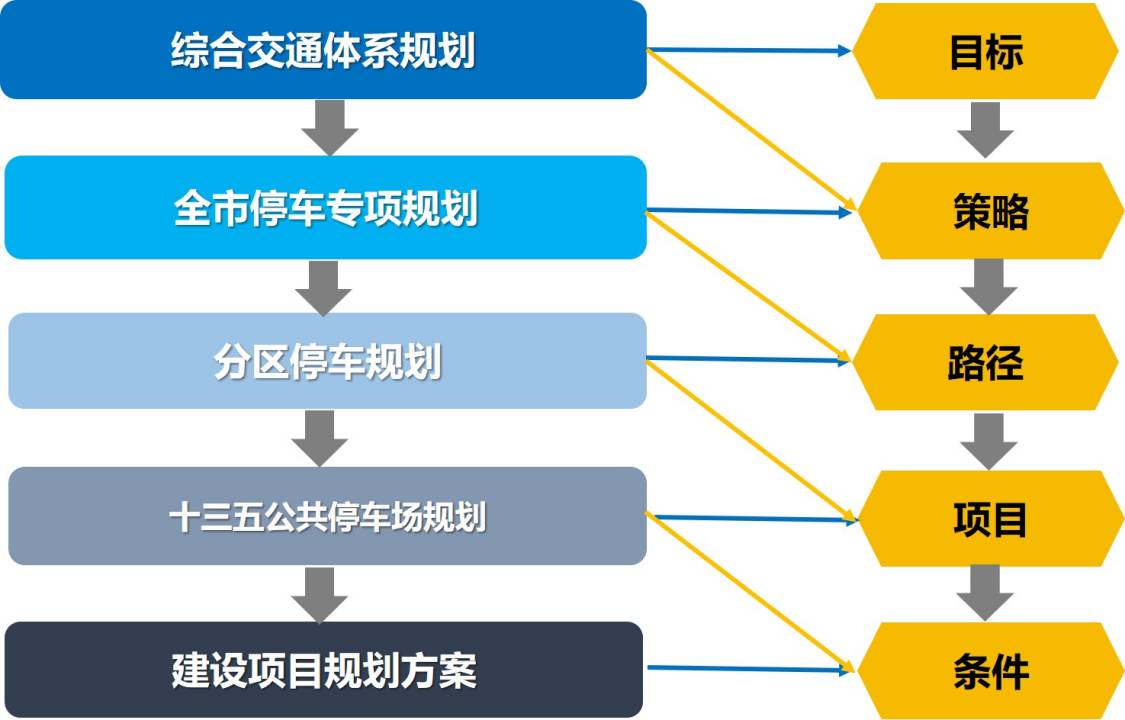 1.创新规划编制体系——多层级协同:在《城市综合交通体系规划标准》与《城市停车规划规范》的基础上,率先构建城市层面多层级协同的停车规划体系,实现了城市规划体系上的全链条衔接与贯穿。