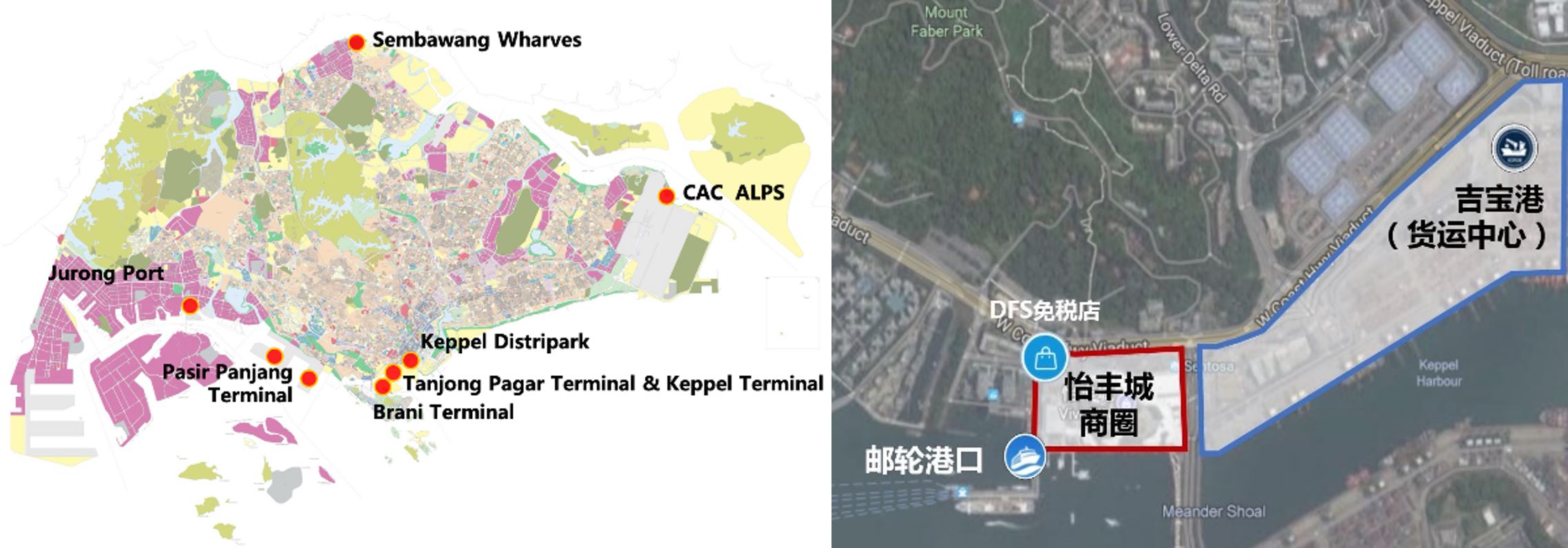 图4 新加坡自贸区分布、吉宝港片区与周边功能分布示意图
