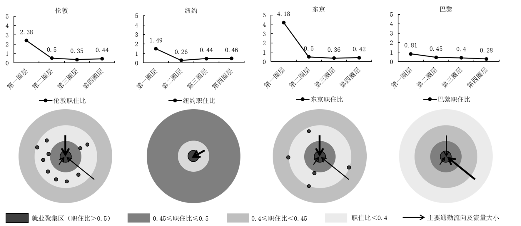 参考既有研究,以5km、15km、30km半径为界,将伦敦、纽约、东京、巴黎大都市区划分为四个空间圈层,开展同尺度对比分析。研究发现,大都市区人口分布形态较为多样化,而中心地区普遍经历了人口先扩散再回流的历程;就业主要建立在共有的强单中心模式基础上,新城规划建设的成功与否对中心-外围关系有显著影响,当前演化趋势是外围地区次中心提升与中心地区内部分化并行;职住空间组织模式分为以纽约为代表的“内外各自平衡”模式和其他大都市区的“圈层梯度平衡”模式。北京及其他发展中的国内大都市区应基于相同空间尺度和相近发展阶段,合理借鉴国际经验,同时为未来的长远发展留有调整余地。