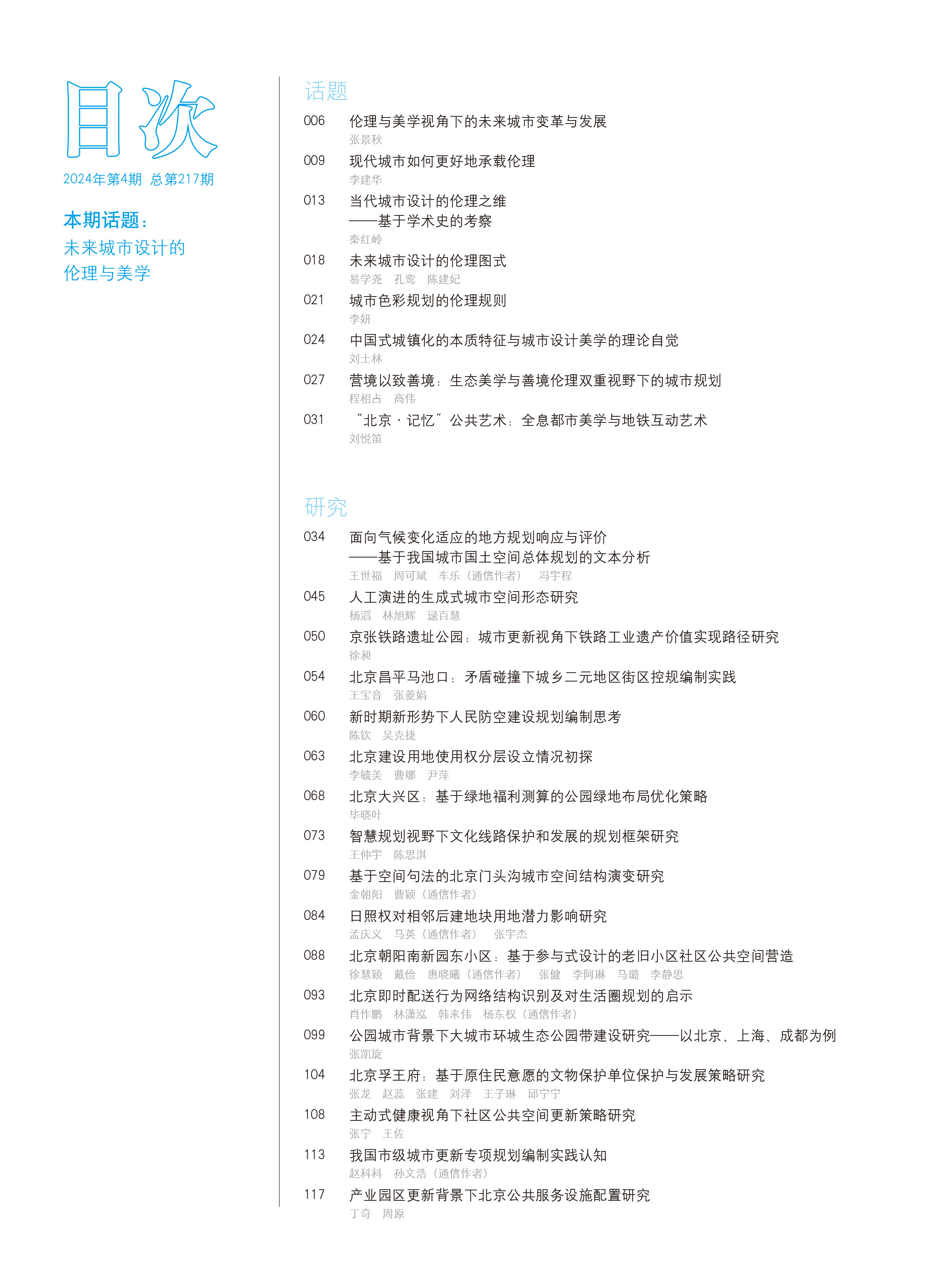 本组文章以北京联合大学应用文理学院张景秋副院长的《伦理与美学视角下的未来城市变革与发展》为开篇,由两大版块组成:未来城市设计美学版块,包括上海交通大学城市科学研究院刘士林院长《中国式城镇化的本质特征与城市设计美学的理论自觉》、中国社会科学院哲学所美学室刘悦笛研究员《“北京·记忆”公其艺术:全息都市与地铁的互动艺术》、中山大学中国语言文学系程相占教授等《营境以致善境:生态美学与善境伦理双重视野下的城市规划》三篇文章;未来城市设计伦理版块,包括武汉大学哲学学院李建华教授《现代城市如何更好地承载伦理》、北京建筑大学文化发展研究院/人文学院秦红岭院长《当代城市设计的伦理之维——基于学术史的考察》、长沙理工大学建筑学院易学尧副教授等《未来城市设计的伦理图式》、北京工商大学设计与艺术学院李妍博士《城市色彩规划的伦理原则》四篇文章。