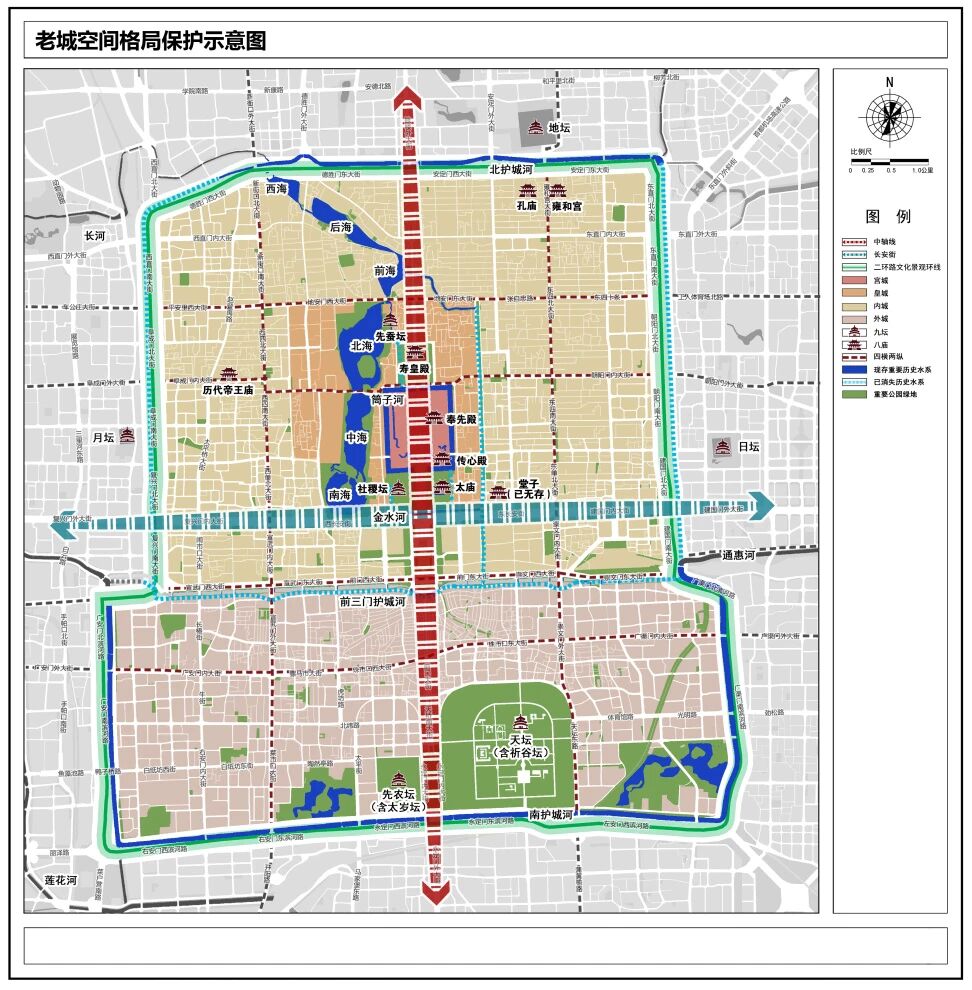 历史格局的保护是实现老城整体保护的关键。《首都功能核心区控制性详细规划(街区层面)(2018年—2035年)》(以下简称《核心区控规》)提出,依托城址遗存、棋盘路网、历史水系、九坛八庙保护,让历史文化融入城市景观,勾勒清晰可辨的四重城廓,实施“四横两纵”城市干道的林荫化改造,推动历史水系恢复,营造“六海映日月、八水绕京华”的水系格局,从而全面强化北京老城空间的整体性。