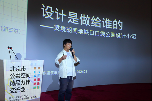 张 曙辉以“设计是做给谁的?——灵境胡同地铁口口袋公园设计小记”为题,分享了北京灵境胡同地铁口休憩区的创新设计,以传统园林为设计灵感,通过与城市景观的结合,以小微空间实现综合功能,提升公共空间的舒适度与利用率,注重空间的可持续维护与人文关怀,小小的空间通过巧妙的设计实现了对社会大众空间需求的细致考量。